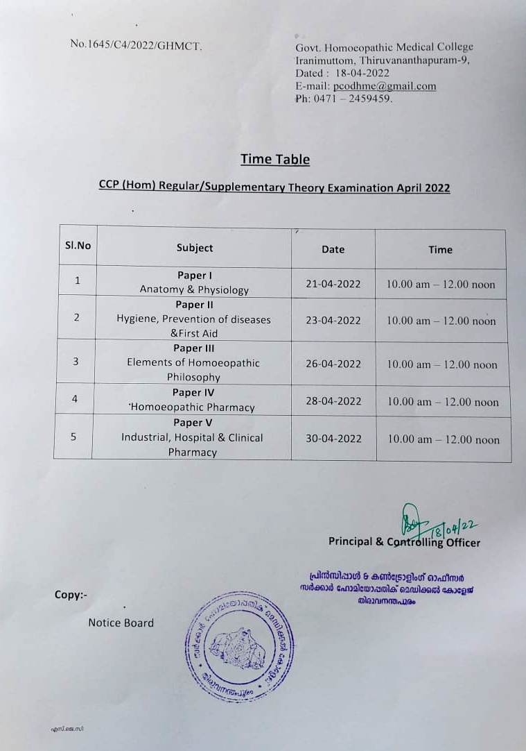 CCP Regular/Supplementary Examinations,April 2022 - Time Table