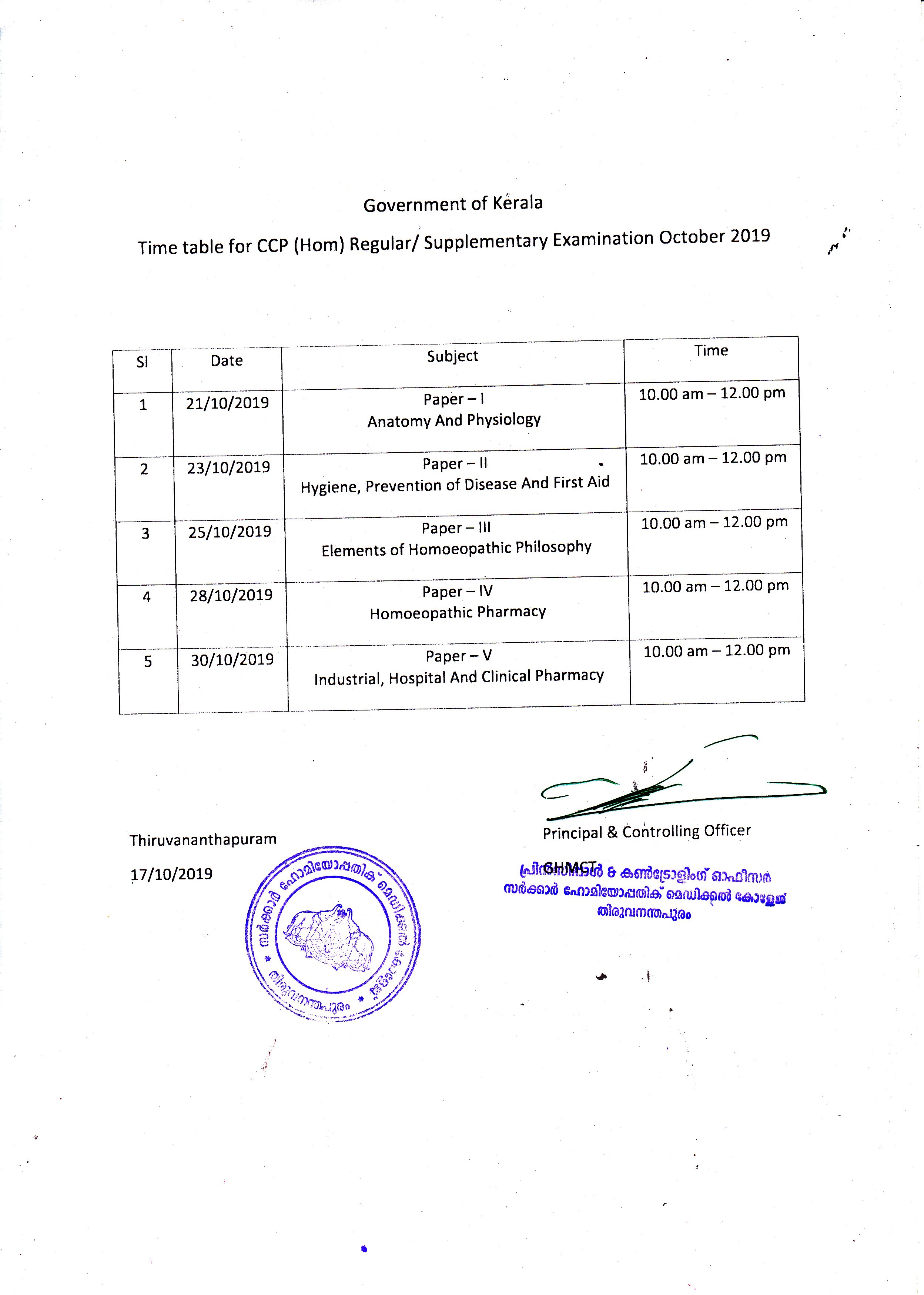 Time table for CCP Regular/Supplementary examination, October 2019